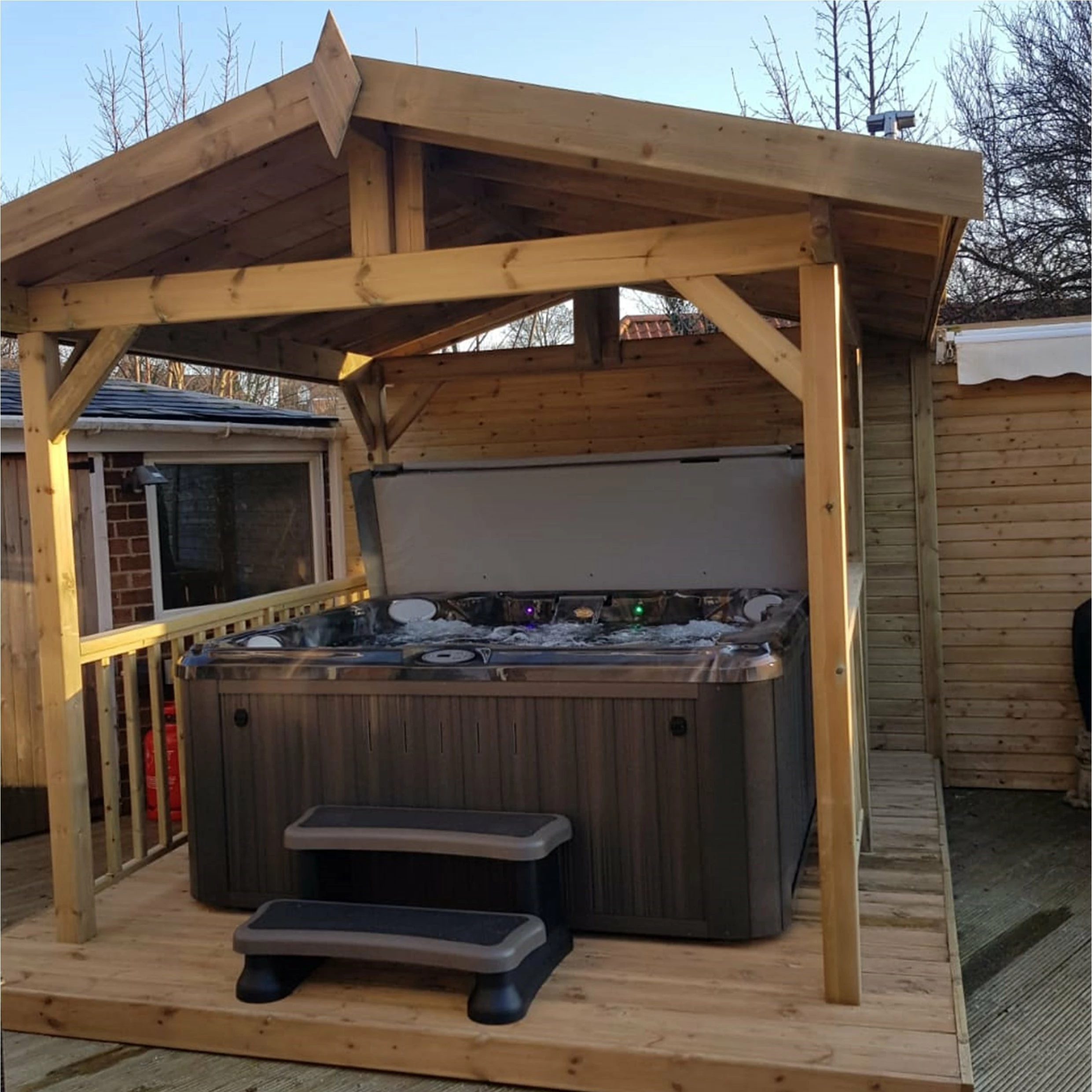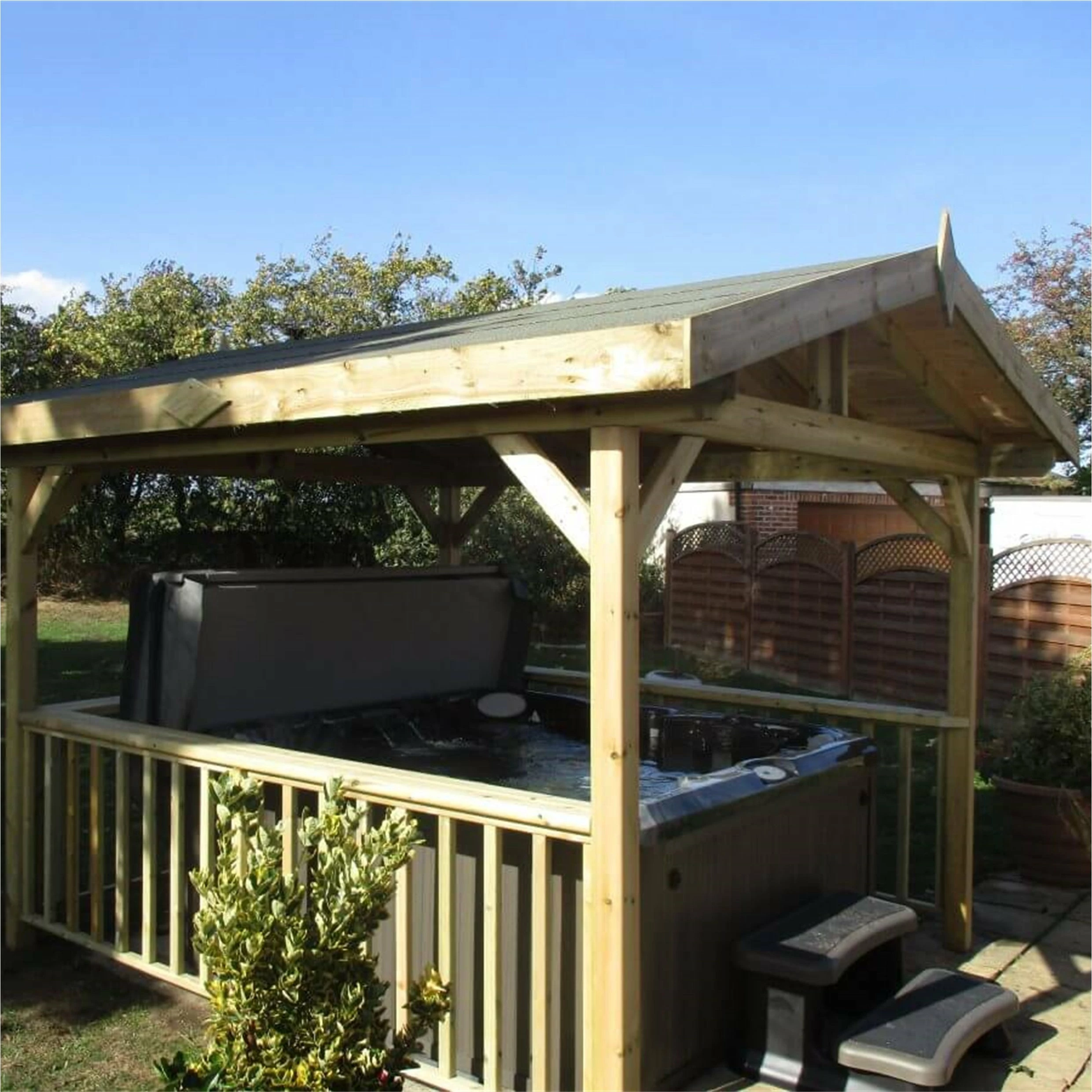 Our Apex Hot Tub Gazebo is made from high quality tanalized pine with a decorative felt roof. The attractive features and innovative design ensures a Hot Tub measuring 213cm x 213cm fits comfortably, including the steps.