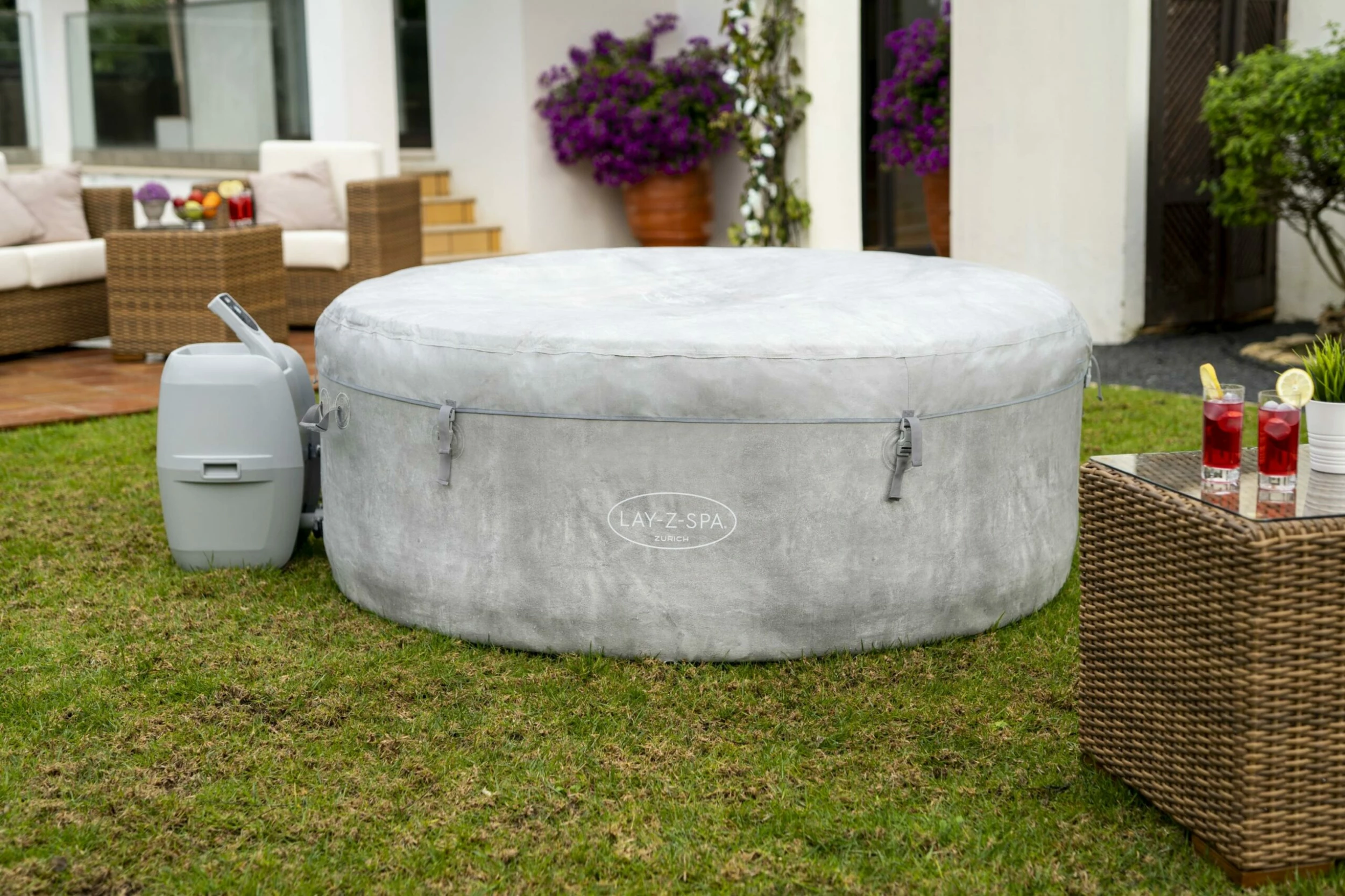 The lay z spa zurich has an integrated EnergySense™ outer and top cover that helps speed up heating and reduces heat loss, making it 40% more energy efficient when compared to similar inflatable hot tubs.