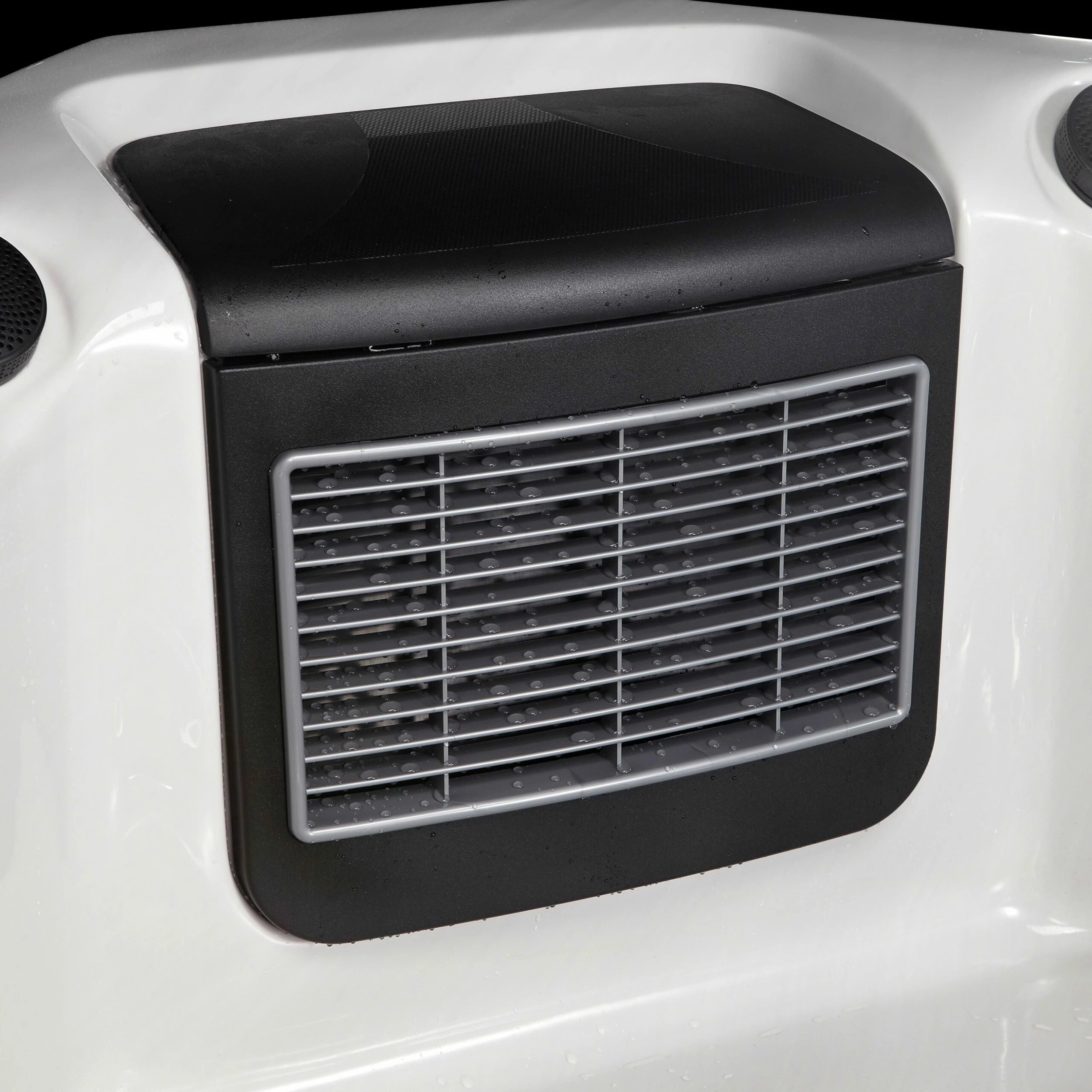 Every part of this hot tub has been well thought out, from the low-maintenance cabinetry, glossy faux marble shell with contoured seating, clever jet placement and the lockable cover that retains heat and saves energy. Stand out features include the mood-lifting LED lights positioned underwater, at water level and on the corner panels, and the Bluetooth sound system that’s perfect for hosting when guests are over. The ozone water filter system keeps it looking good.