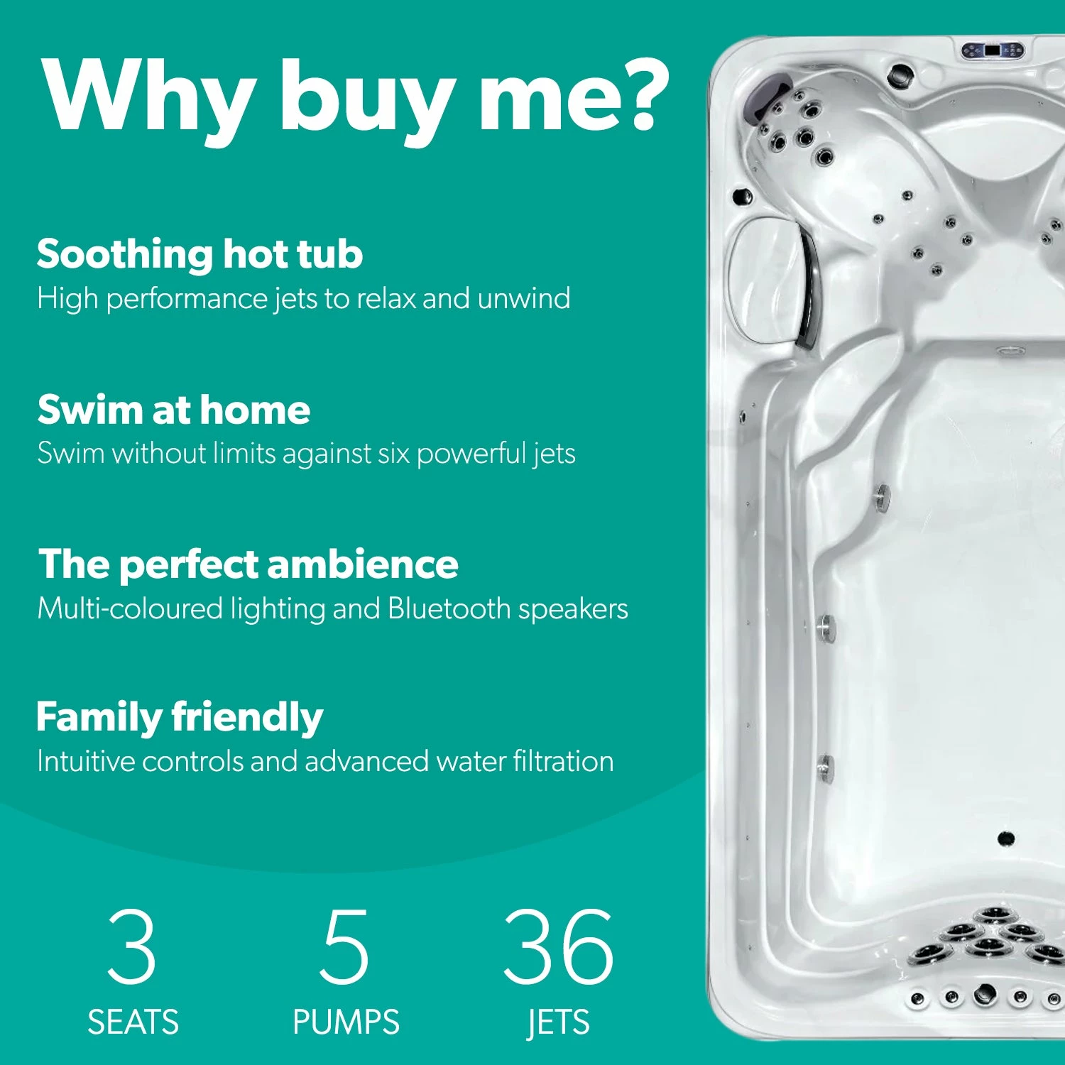 Enjoy the benefits of a swimming pool and hot tub in one with this stunning yet compact 14ft swim spa with 36 individual jets, a 2-horsepower jet pump and three 3-horsepower swim pumps. There are three seating positions, including two loungers, and plenty of room to enjoy a soak. It’ll look good in your garden or home all year round.