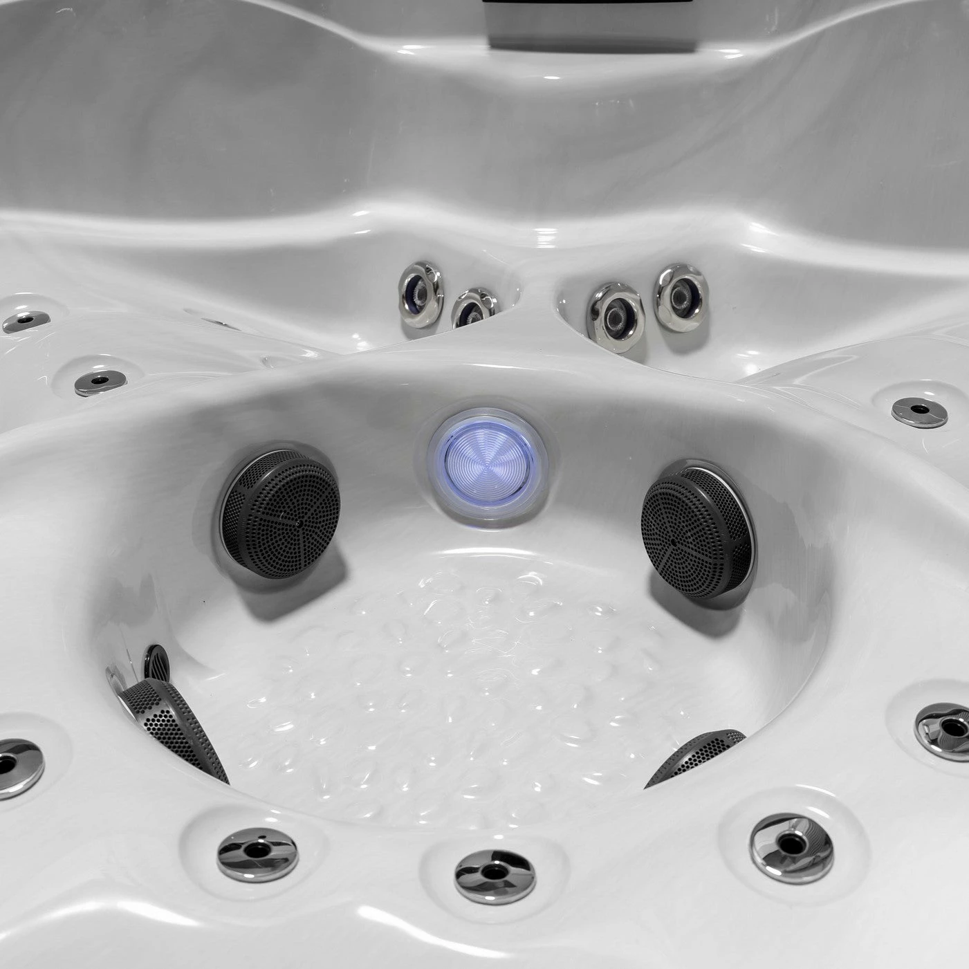 - Compact, family-sized 5-seater hot tub with 2 loungers